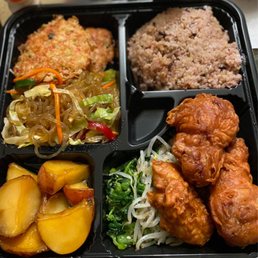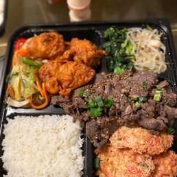 I love that they have a Korean Bbq to go restaurant so close to my home. Whenever I'm getting cravings, I can come here to grab a quick bite. Service is usually pretty quick and efficient. My favorites from here are the pork bulgogi, jap chea, fish cakes, braised potatoes, and korean salad. You can't really go wrong with most of the menu items. I have tried many and really enjoyed them. Another great mention is the delicious brown rice. I usually like to order my meal with white rice but whenever I come here, I always order the brown rice. If you're in the area, you should definitely give this place a go. Not much seating for a huge family. Theres only maybe 2 small tables inside and limited seating. This is meant for to-go so maybe thats why.